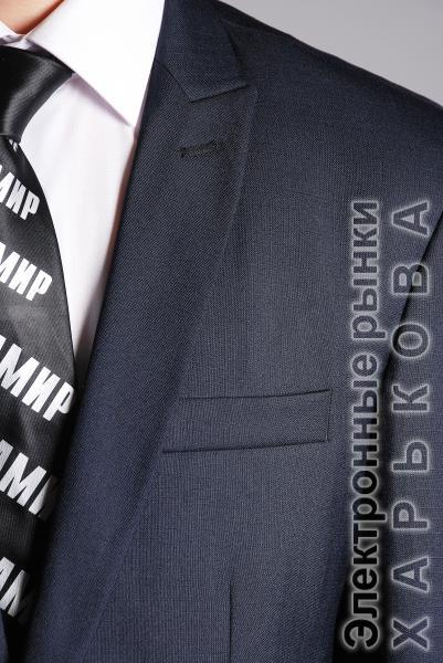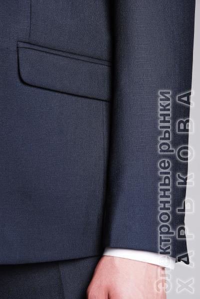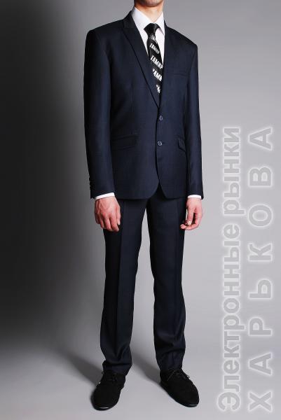 Тёмно-синий молодёжный костюм,с зауженной линией силуэта.Пиджак с двумя шлицами,на 2 пуговицы.Ворот сборный с уголком,выступающим наружу.Брюки без защипа с косыми боковыми карманами.