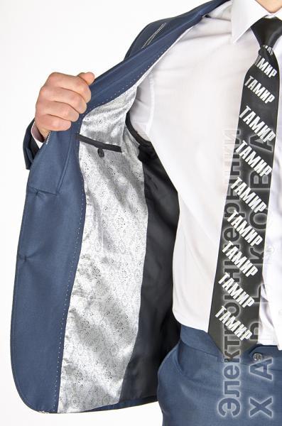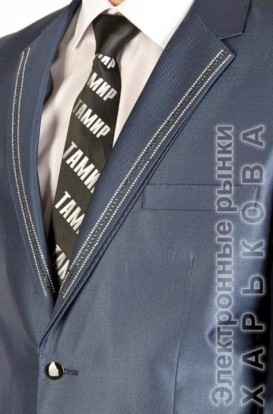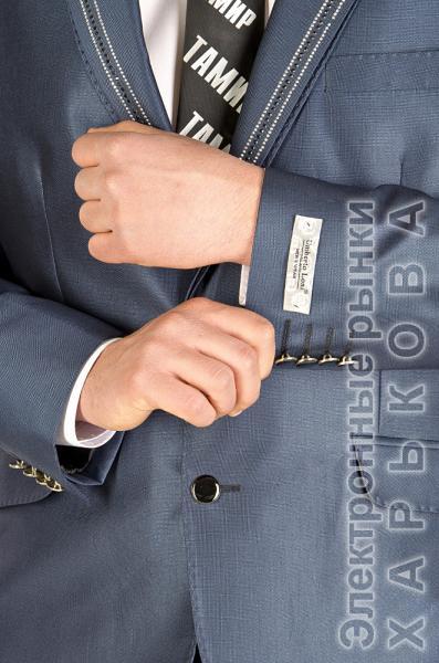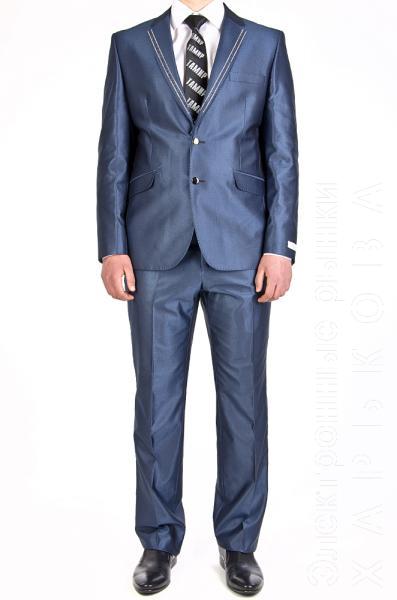 Костюм классический синий с блеском, декорирован сёмными пластронами. Пиджак на две пуговицы (на ножке), с одной шлицей . Брюки со средней посадкой, без защипа.