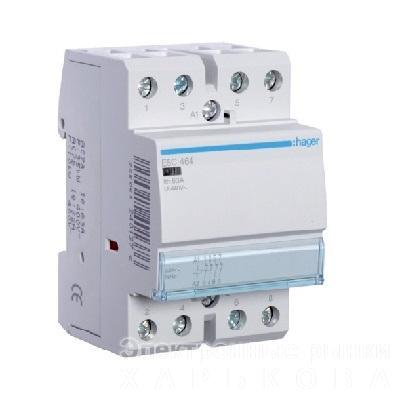 Контактор ESC464 63А 4НЗ 230В Hager — модульный электромагнитный контактор без ручного управления, предназначенный для коммутации мощных нагрузок в системах освещения, отопления, вентиляции, насосов и других силовых цепей переменного тока.