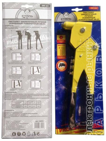 Технические характеристики Сталь HR-03, 280 мм (64002) Конструктивные и функциональные особенности Конструкция угловые Дополнительная информация Тип заклепки вытяжной (тяговый) Размер гвоздя/скобы/заклепки 2.4 мм 3.2 мм 4.8 мм 4 мм Материал заклепки сталь Комплектация один заклепочник Вес 0.688 кг Класс бытовые Страна происхождения Китай Комплектация - Пистолет заклепочный; - блистер Производитель оставляет за собой право вносить изменения в комплектацию или характеристики модели без уведомления продавца.