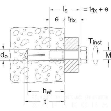 Внутрішня різьба d M10; Діаметр бура, анкера d(0) 12 мм.; Мін. Глибина внутрішньої різьби L(thmin) 15 мм.; Довжина L 40 мм.; Глибина отвору h(0) 40 мм.; Технічні дані Бетон С20/25, ETA Option 7, вирив 7 кН; Мін. відстань між анкерами, ETA Option 7, s(min) 120 мм.; Мін. відстань від краю ETA Option 7, c(min) 140 мм.; Мін. товщина базового матеріалу ETA Option 7, h(min) 120 мм.; Момент затяжки T(inst) 15 Нм.